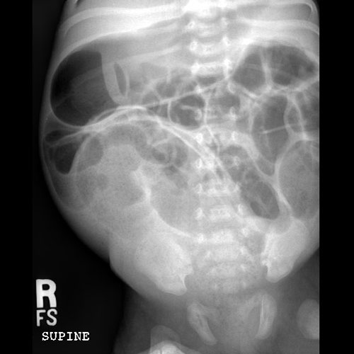 1-day-old full term infant with multiple dilated loops of bowel on plain radiograph.Exam