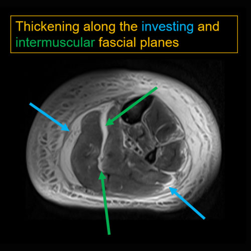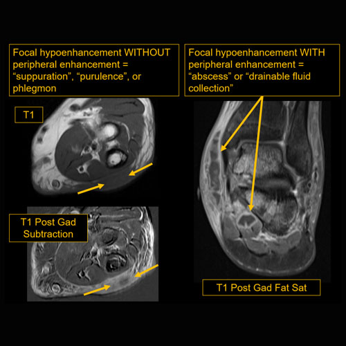 Section 1 Submit Findings CB1138 Findings Limitations There is patient motion or other limitations. Yes No Skin/Hypodermis There is edema or hyperenhancement. Yes No There is soft tissue ulceration or sinus tract. Yes No There is gas or foreign body. Yes No There is confluent hypoenhancement to suggest phlegmon, suppuration, abscess, or drainable fluid collection in the hypodermis. Yes No Investing/Intermuscular Fascia There is edema, thickening, or hyperenhancement. Yes No There is hypoenhancement or gas/susceptibility artifact. Yes No There is bulging of the fascia. Yes No Muscles There is edema or hyperenhancement. Yes No There is hypoenhancement, lack of enhancement, or organized fluid collection. Yes No There is fatty atrophy. Yes No Bones There are fractures. Yes No There is periosteal reaction, osseous destruction, or other abnormal marrow to suggest osteomyelitis. Yes No There is osseous hypoenhancement or lack of enhancement to suggest loss of bone viability. Yes No There is cloaca, sequestrum, or involucrum. Yes No There is a subperiosteal or intra-osseous abscess. Yes No Visualized Joints There is a joint effusion or synovitis. Yes No There is malalignment, degenerative changes, or other gross internal derangement. Yes No Miscellaneous There is tenosynovitis. Yes No Major visualized vascular structures are abnormal. Yes No Major visualized nerves are abnormal. Yes No