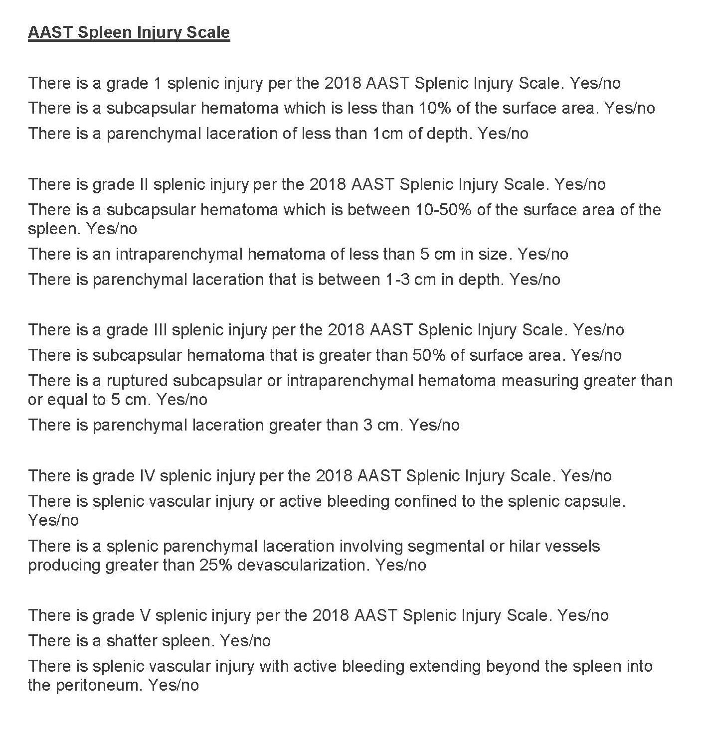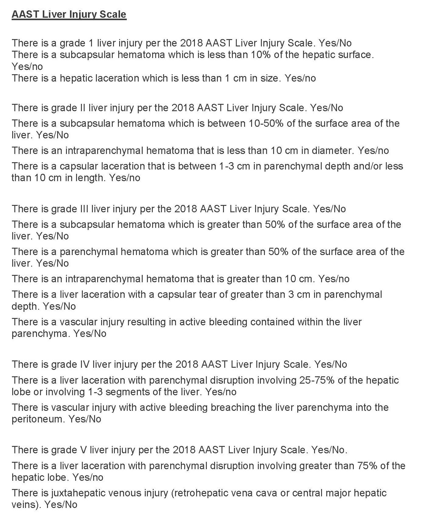 Section 1 Submit Findings CB1506 Findings FINDINGS The technique is suboptimal - motion artifact, inaccurate contrast bolus, metallic artifact, etc. Yes No MEDIASTINAL WINDOWS The thyroid is enlarged. Yes No N/A There are focal lesions in the thyroid gland. Yes No N/A There is aortic arch and branching abnormality. Yes No N/A There is dissection of the aorta. Yes No N/A The heart is enlarged. Yes No There is evidence of heart rupture. Yes No There is cardiac aneurysm. Yes No There is pleural or pericardial effusion. Yes No There is mediastinal, hilar, or axillary adenopathy. Yes No N/A There is a small volume of residual thymic tissue which enhances homogenously. Yes No N/A There is mediastinal hematoma. Yes No N/A There is evidence of penetrating injury. Yes No LUNG WINDOWS There is focal air space opacity. Yes No There is focal lucency in the lung to suggest laceration. Yes No There are signs of aspiration. Yes No The trachea/bronchi are small/large in caliber. Yes No There is intraluminal filling defect bronchus/trachea/segmental bronchi. Yes No N/A There is pneumothorax/pneumomediastinum. Yes No There is subcutaneous emphysema. Yes No There are lung nodules/masses. Yes No BONE WINDOWS There are fractures. Yes No There are lytic/blastic lesions. Yes No LIVER INJURY SCALE There is a grade I - V liver injury per the 2018 AAST Liver Injury Scale. Yes No HEPATOBILIARY There are focal hepatic lesions-laceration/hematoma in the left lobe/right lobe. Yes No There is soft tissue/hematoma in the liver hilum/porta. Yes No There is periportal hypodensity. Yes No There is intrahepatic biliary ductal dilatation. Yes No The CBD is dilated. Yes No There is pseudoaneurysm in the liver. Yes No There is subcapsular hematoma. Yes No There is arterial blush in the liver parenchyma. Yes No There is contrast extravasation on the delayed images. Yes No Gallbladder is distended. Yes No There is fluid in the gallbladder fossa. Yes No PANCREATIC INJURY SCALE There is a grade I - V pancreatic injury per the 2018 AAST Pancreatic Injury Scale. Yes No PANCREAS There is hypodensity/hematoma in the pancreas. Yes No There is fluid/hemorrhage in the lesser sac. Yes No The pancreatic duct is dilated. Yes No There is heterogenous fluid collection/collection with fluid fluid level in the pancreas. Yes No There is peripancreatic collection. Yes No There is pancreatic transection/laceration. Yes No The peripancreatic fat shows infiltration. Yes No The pancreas is enlarged/small. Yes No The pancreas is hyperenhancing. Yes No SPLEEN INJURY SCALE There is a grade I - V spleen injury per the 2018 AAST Spleen Injury Scale. Yes No SPLEEN The spleen is enlarged. Yes No There is focal lesion (contusion/hematoma/laceration) in spleen. Yes No There is pseudoaneurysm in the spleen. Yes No There is subcapsular hematoma. Yes No There is arterial blush in the splenic parenchyma. Yes No There is contrast extravasation on the delayed images. Yes No There is decreased perfusion to the spleen. Yes No ADRENALS The adrenal gland is enlarged (right or left). Yes No There is hypodense mass in the adrenal gland. Yes No The adrenal glands are hyperenhancing. Yes No RENAL INJURY SCALE There is a grade I - V renal injury per the 2018 AAST Renal Injury Scale. Yes No KIDNEYS/URETERS There is renal contusion/laceration/hematoma. Yes No There is subcapsular hematoma. Yes No There is retroperitoneal/perinephric collection. Yes No There is arterial/venous extravasation in renal parenchyma. Yes No There is vascular injury (vascular disruption/thrombosis). Yes No On delayed imaging, there is contrast extravasation from the collecting system. Yes No The perfusion to the kidneys is increased/decreased. Yes No There is persistent ureteral enhancement. Yes No PELVIC ORGANS/BLADDER There are focal lesions in the ovaries/uterus/prostate. Yes No The urinary bladder is collapsed. Yes No There is contrast extravasation from the bladder into the soft tissues on delayed imaging. Yes No There is contrast extravasation from the bladder into the peritoneal space on the delayed images. Yes No There is a filling defect in the bladder. Yes No The bladder was is thickened. Yes No PERITONEUM There is free fluid/hemorrhage in the peritoneum. Yes No There is free/loculated air. Yes No LYMPH NODES There is intraabdominal/retroperitoneal/mesenteric/pelvic adenopathy. Yes No VESSELS There is dissection of aorta. Yes No There is active extravasation of contrast from aorta. Yes No Aorta is small in size. Yes No IVC is small in caliber. Yes No IVC is hyper enhancing. Yes No There is hypodensity around the IVC. Yes No GI TRACT There is focal wall thickening/hematoma/intramural hematoma-duodenum/jejunum. Yes No There is bowel obstruction. Yes No There is focal mesenteric stranding/hematoma. Yes No There is bowel perforation. Yes No There is leakage of oral contrast. Yes No There is focal ileus. Yes No There is focal decreased bowel enhancement. Yes No There is diffuse bowel wall thickening. Yes No There is diffuse bowel wall enhancement. Yes No SOFT TISSUES There are foreign bodies. Yes No There is laceration of the soft tissue. Yes No There is anterior abdominal wall contusion/seat belt sign. Yes No