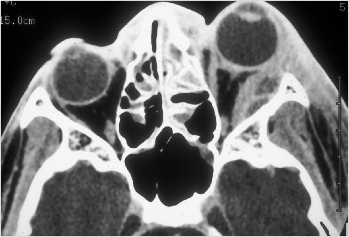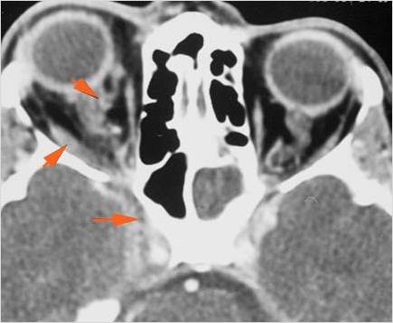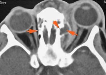 74-year old insulin-dependent diabetic female in the emergency room with fever, sinusitis with possible orbital, intracranial or other complications such as cavernous sinus thrombosis.Exam