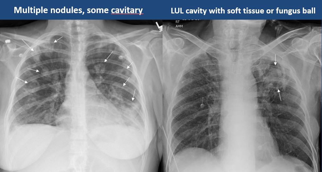 There is cavitary or cystic disease with or without air fluid levels or soft tissue nodularity. [Yes/No]