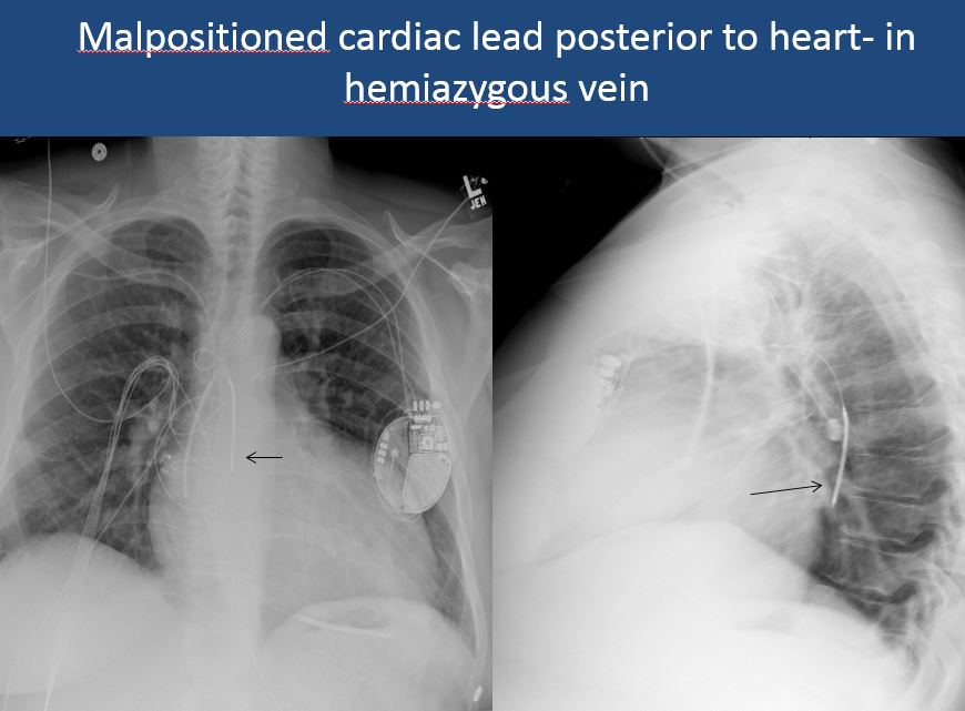 There is a cardiac pacemaker/AICD or temporary transvenous pacemaker and the leads are fractured or in an abnormal location, not in the RA, RV, or coronary sinus. [Yes/No]
